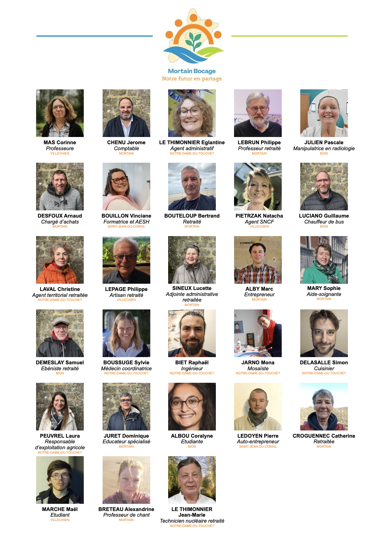« Je m'engage, dans cette aventure humaine, avec le souhait de travailler vers l'amélioration du cadre de vie des habitants de Mortain-bocage, de mettre la proximité au coeur de mes actions quotidiennes, d'investir du temps pour faire avancer les projets auxquels je crois en lien avec les besoins exprimés par les mortainais des 5 communes tout en restant à l’écoute. », Corinne « Offrir la possibilité aux citoyens d'avoir un véritable choix », Mona « J'ai choisi de participer à la liste Mortain Bocage Notre Futur En Partage car je vis et je travaille à Mortain Bocage depuis 25 ans. J'ai toujours apprécié ce territoire et je veux préserver son caractère exceptionnel grâce à ses commerces ses écoles, ses associations sa culture locale et son patrimoine. », Dominique « Mes engagements associatifs (AJSL, Comité de la Manche de handball) m’ont transmis le sens du collectif, de la solidarité et de l’engagement. Aujourd’hui, j’ai envie de continuer à m’investir pour Mortain-Bocage afin de contribuer à une commune toujours plus attractive, vivante et dynamique, au service de ses habitants, de ses associations et de ses commerces. », Philippe Lebrun « Je m’engage pour vous à Villechien parce que l’avenir de notre commune se construit par des décisions justes, prises avec et pour les habitants. », Natacha « Être utile à l’amélioration de la cité en exprimant mes suggestions pour le bien être de tous et en relayant celles des autres. », Samuel
